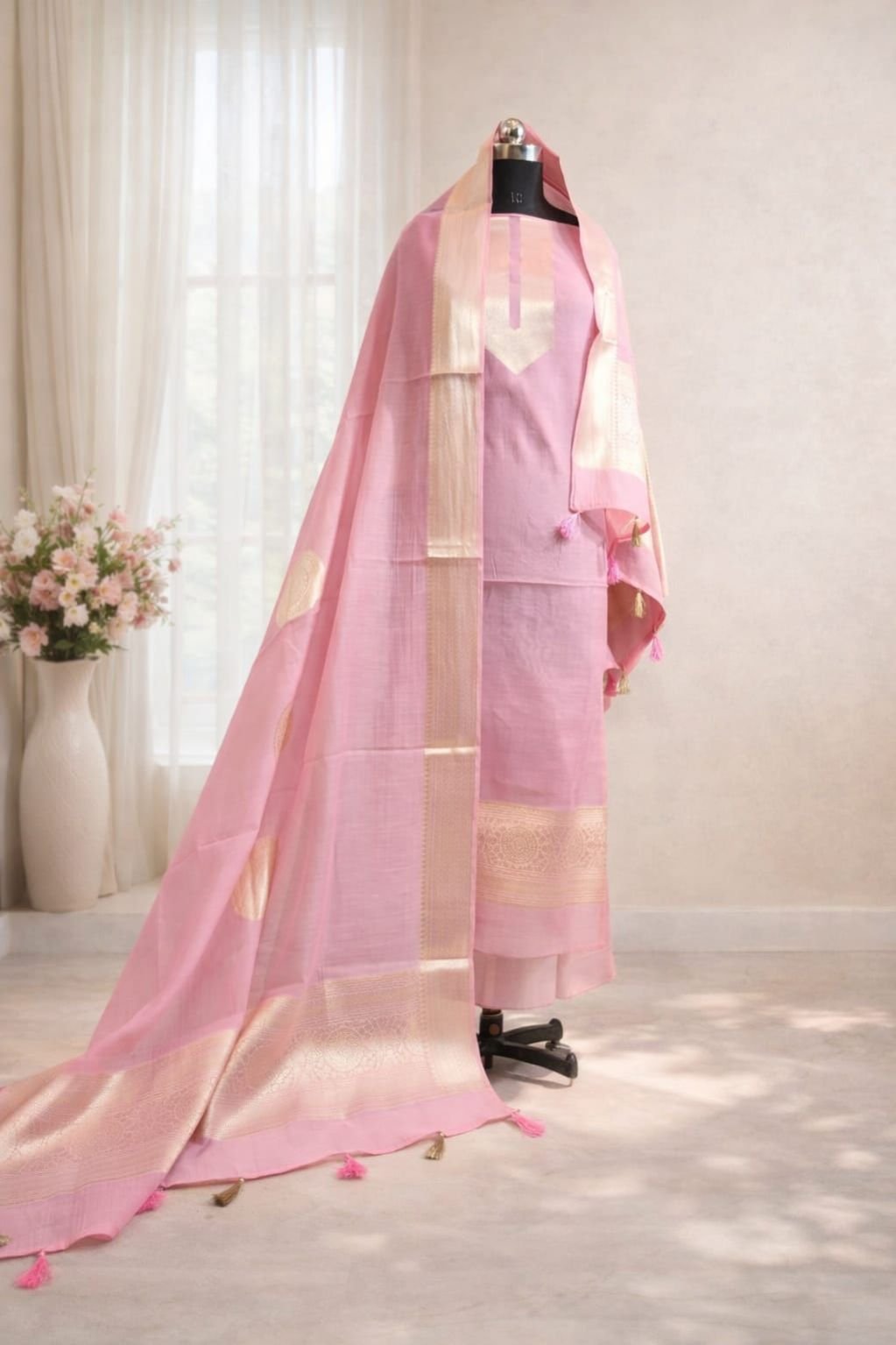A soft and breathable mul unstitched suit set in elegant blush pink shade, paired with a beautifully woven Banarasi zari dupatta – perfect for summer wear, festive gatherings and daily ethnic elegance.