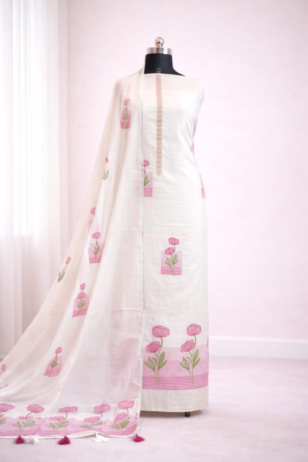 Experience comfort with elegance in this premium unstitched cotton suit set, designed for effortless ethnic styling. The soft cotton texture, subtle woven buti pattern, and artistic motif placement create a graceful and refined look.