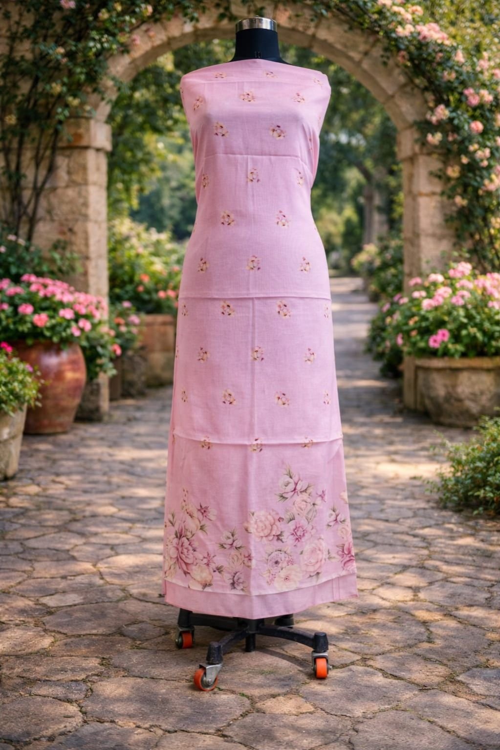 A soft and breathable mul unstitched suit set in elegant blush pink shade, paired with a beautifully woven Banarasi zari dupatta – perfect for summer wear, festive gatherings and daily ethnic elegance.