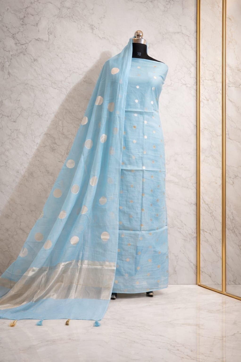 A soft and breathable mul unstitched suit set in elegant blush pink shade, paired with a beautifully woven Banarasi zari dupatta – perfect for summer wear, festive gatherings and daily ethnic elegance.