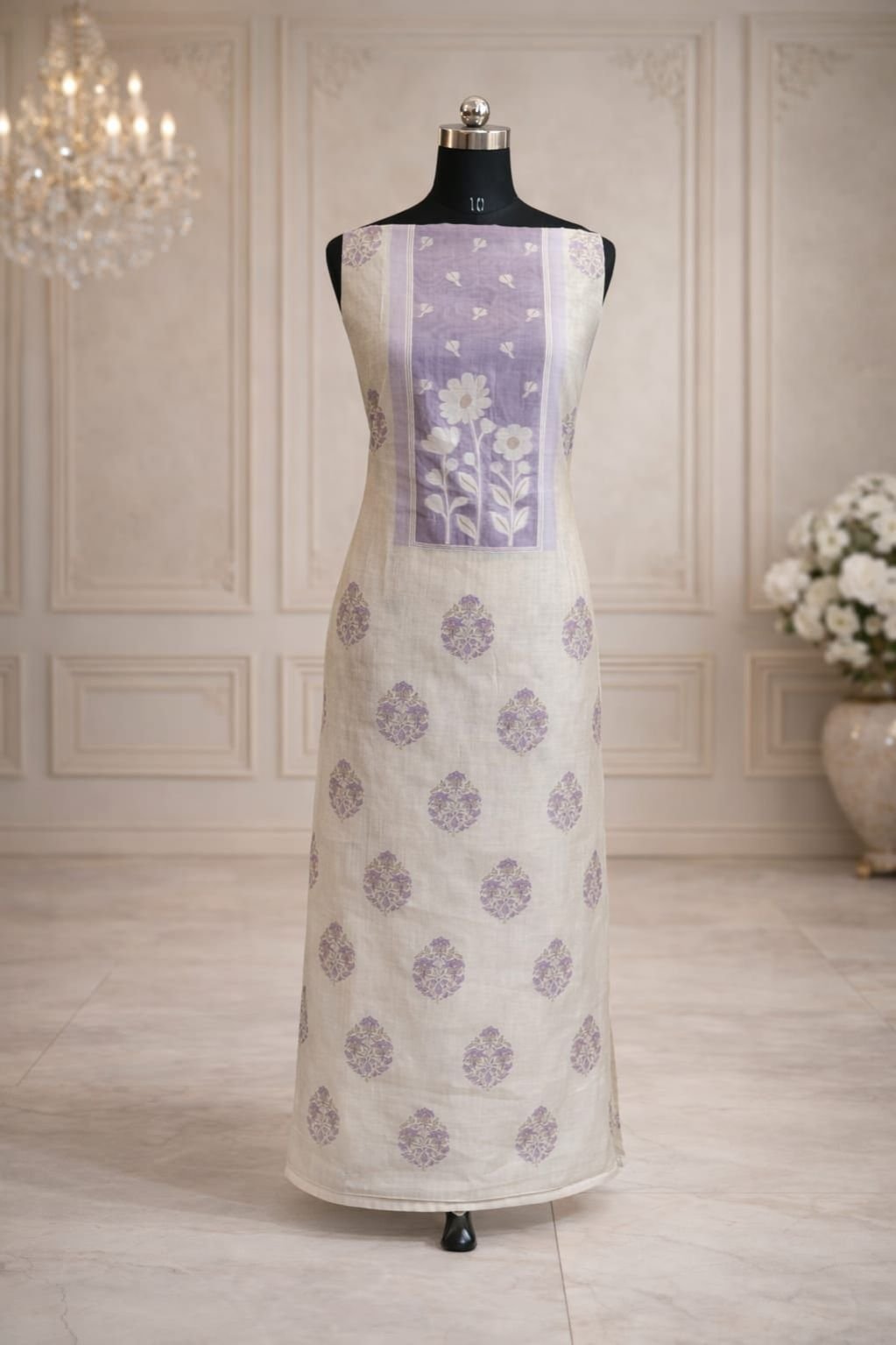 Experience comfort with elegance in this premium unstitched cotton suit set, designed for effortless ethnic styling. The soft cotton texture, subtle woven buti pattern, and artistic motif placement create a graceful and refined look.