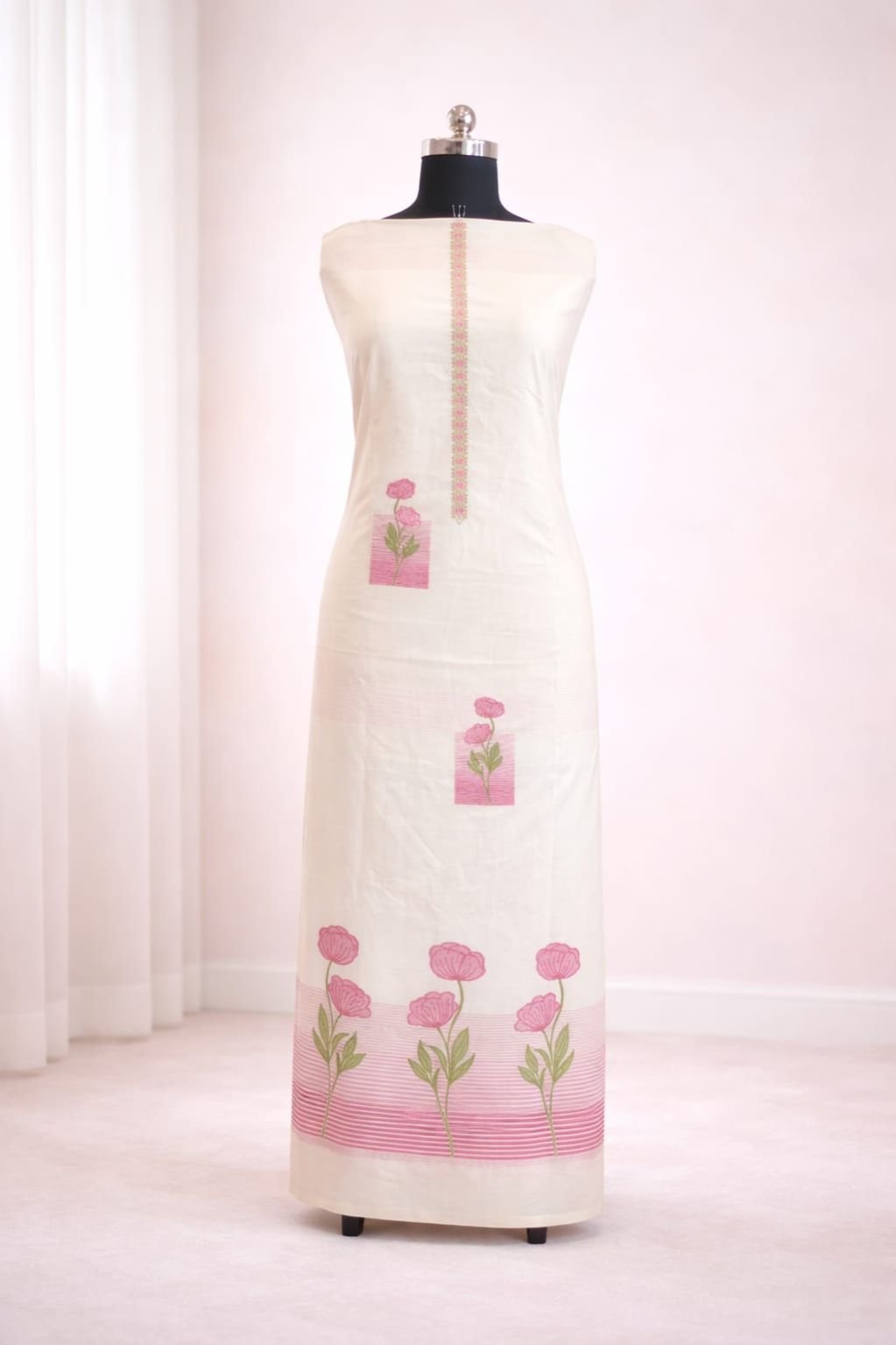 Experience comfort with elegance in this premium unstitched cotton suit set, designed for effortless ethnic styling. The soft cotton texture, subtle woven buti pattern, and artistic motif placement create a graceful and refined look.